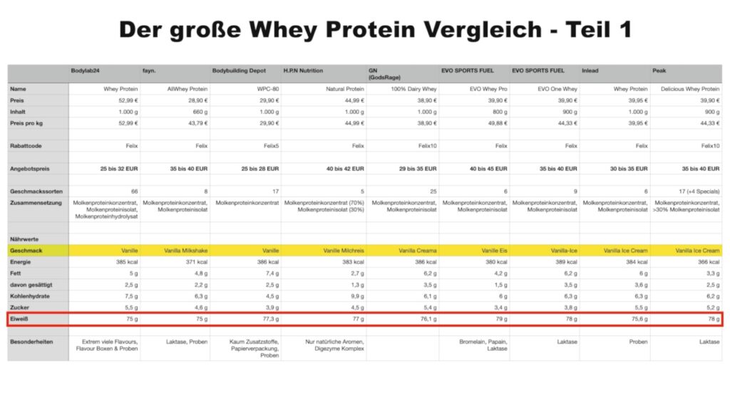 Um hier eine gute Vergleichbarkeit zu schaffen, habe ich von jeder Marke immer den Vanille Geschmack genommen, da den auch tatsächlich so mehr oder weniger jeder im Sortiment hatte. Und was auffällt ist, dass der Eiweißgehalt durch die Bank weg bei zwischen 75 und 79 g liegt. Also auch das Bodybuilding Depot mit ihrem als einziger reinen Molkenproteinkonzentrat fällt hier nicht großartig ab, eher im Gegenteil sogar, aber dazu kommen wir gleich.