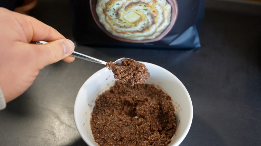 Der Maisgrieß ist eine völlig neue Form nach Zitat „Art der amerikanischen Südstaatenküche“, die mir so zuvor auch tatsächlich noch nie begegnet ist und die sich auch deutlich von bisherigen Mais-Puddings von einem Bodylab zum Beispiel unterscheidet. In der Praxis zieht dieser Maisgrieß nämlich nur sehr langsam das Wasser auf – man muss also etwas mit der Mikrowelle nachhelfen – dadurch wird aber auch das Ergebnis recht körnig und ist nochmal spürbar anders als der sonst eher schleimigere Mais Pudding von den anderen.