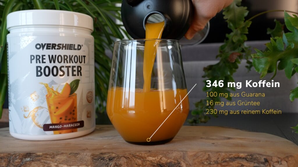 Last but not least hat dann auch noch Overshield ihrem Standard Pre Workout Booster mit Mango Maracuja einen neuen Geschmack verliehen. Generell lässt sich über dieses Produkt sagen, dass wir es mit einem absoluten Preis-Leistungs-Monster zu tun haben. Wir bekommen für einen Preis von vor Rabattcode Felix 25,80 EUR einen Allrounder Booster mit pro Portion unter anderem 6 g Citrullin sowie fast 2 g Glyceromax für den Pump sowie 346 mg Koffein aus sowohl Guarana Extrakt, Grüntee Extrakt und normalem Koffein, was in Summe echt ordentlich ist.