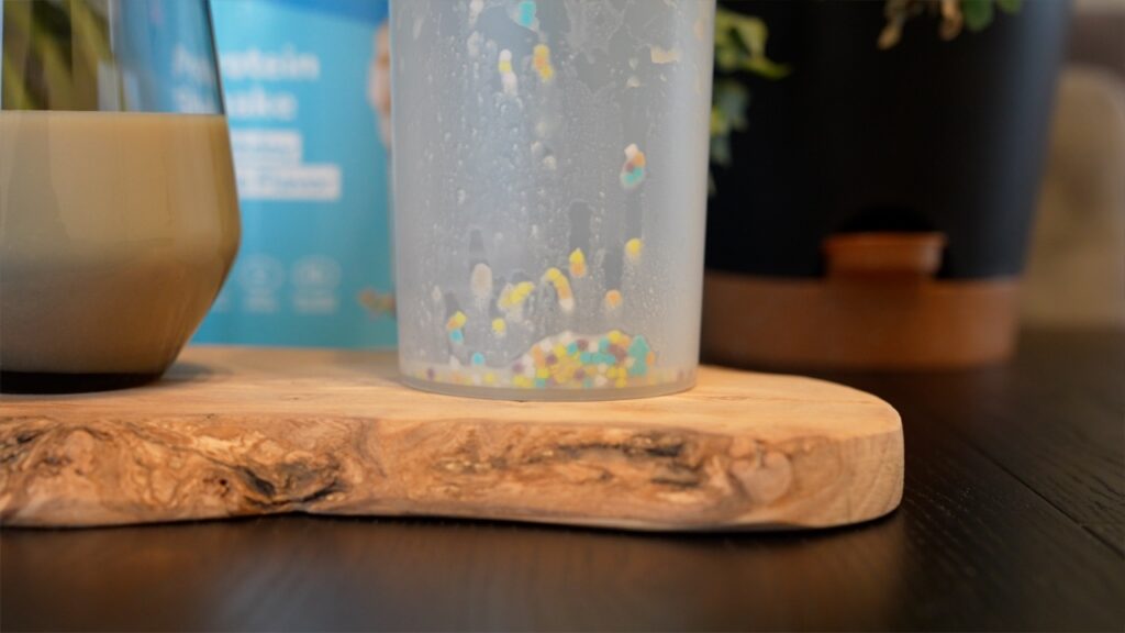 Rocka Nutrition hat zu ihrem 11. Geburtstag ihren Limited Protein Shake im Birthday Cake Flavor zurückgebracht. Dieses Protein mit 65 g Eiweiß setzt als Besonderheit und passend zum Anlass auf bunte Streusel im Pulver, die zwar schön aussehen, nur sich leider sehr schnell am Boden des Shakers oder Glases absetzen. Man sieht es in der Aufnahme hier auch gut, was alles nicht im Glas gelandet ist.