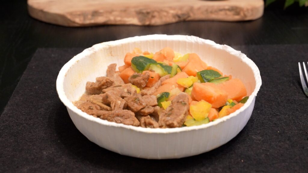 Von der Umsetzung bin ich aber dieses Mal nur so semi überzeugt. Für mich schmeckt es durch die salzarme Natur dieser Athletes Line Gerichte einfach zu lasch, was vor allem auch an dem etwas wässrigen Paprika und Zucchini Gemüse liegt. Zudem bin ich bei den Rinderstreifen einige Male meinem persönlichen Albtraum Sargent Schwabbel begegnet – Grüße an Colin gehen raus an dieser Stelle – und da bin ich leider sehr pingeling.