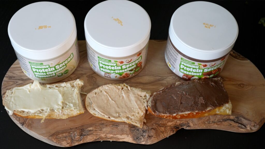 Für den Abschluss dieser Folge nehmen wir uns jetzt noch das Thema Aufstrich vor. Dort haben nochmal Inlead, aber auch Vit4Ever etwas Neues herausgebracht. Bei Vit4Ever handelt es sich eine Protein Spread mit anteilig 24% Eiweiß, wobei ich hier ehrlicherweise anmerken muss, dass man diese Spreads eher als zuckerfreie Alternative zu Nutella und Co. als wirkliche Proteinquelle betrachten sollte, denn aufgrund des hohen Fettgehalts ist das Verhältnis aus Protein zu Kalorien nicht der Rede wert.