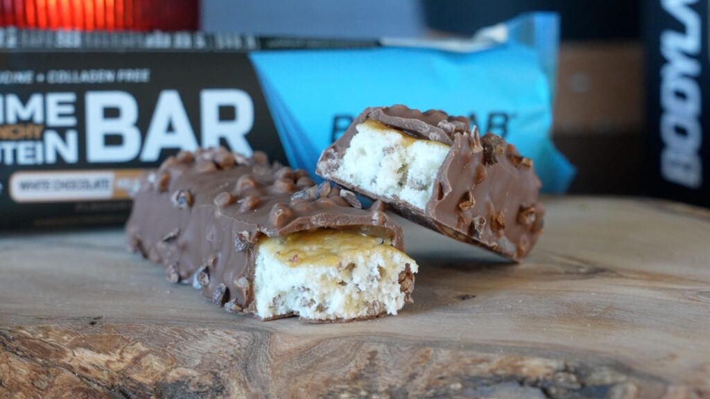 Neben den Wheys hatte Bodylab im Dezember aber noch eine Neuheit im Gepäck. Nach mehreren Monaten Pause ist nun nämlich endlich wieder der Prime Crunchy Protein Bar zurückgekehrt und das mit White Chocolate Milky Caramel auch gleich in einer zweiten neuen Geschmacksrichtung. Der Riegel ist für mich der absolut stärkste im gesamten Sortiment bei Bodylab, weil er nicht nur über 20 g kollagenfreies Eiweiß bietet, sondern dazu auch noch 3 g Leucin enthält und dabei in Sachen Kalorien nicht über das Ziel hinausschießt. Der neue Geschmack überbietet die Nährwerte von American Brownie sogar nochmal ein bisschen, bietet allerdings anders als der Name suggeriert keine Weiße Schokolade, sondern einen klassischen Milchschokoladenüberzug. Tatsächlich ist Bodylab da ein Fehler unterlaufen, der aber kurzfristig nicht zu korrigieren war.