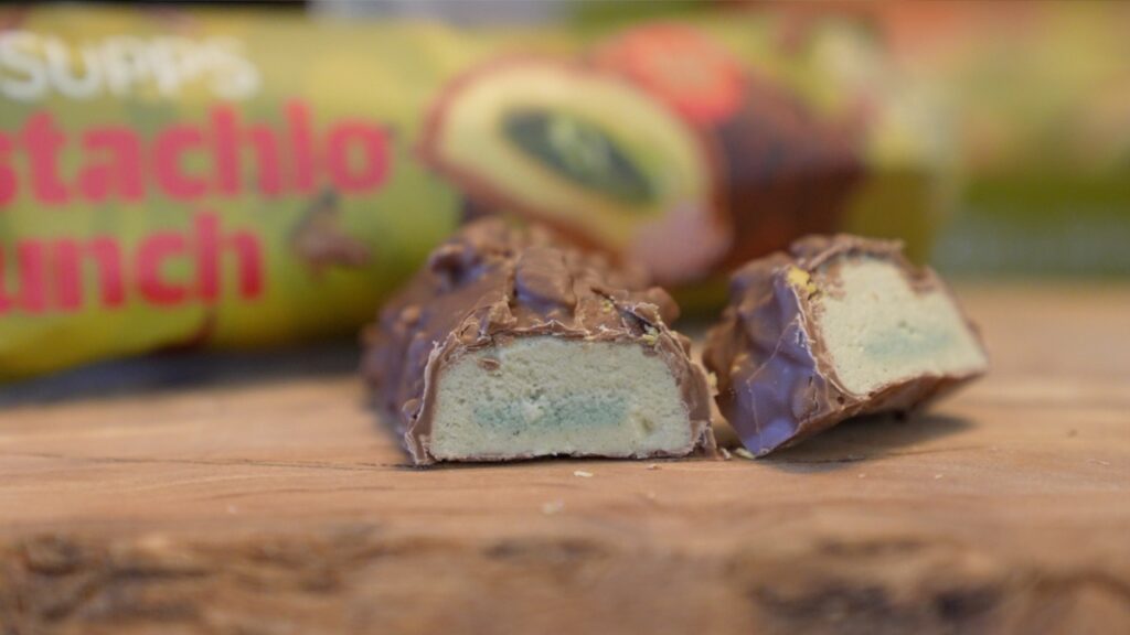 Auf Seiten von Neosupps gab es im Dezember mit Pistachio Crunch einen weiteren neuen Proteinriegel. Der bietet einen Schokomantel aus Milchschokolade mit echten Pistazien verfeinert und einer leider nicht vegetarischen Proteinschicht mit einem Kern aus Pistazienbutter, die sich allerdings aufgrund der Tatsache, dass der Riegel generell sehr soft ausfällt, in Sachen Konsistenz nicht so absetzt wie das die Verpackung einem glauben machen möchte.