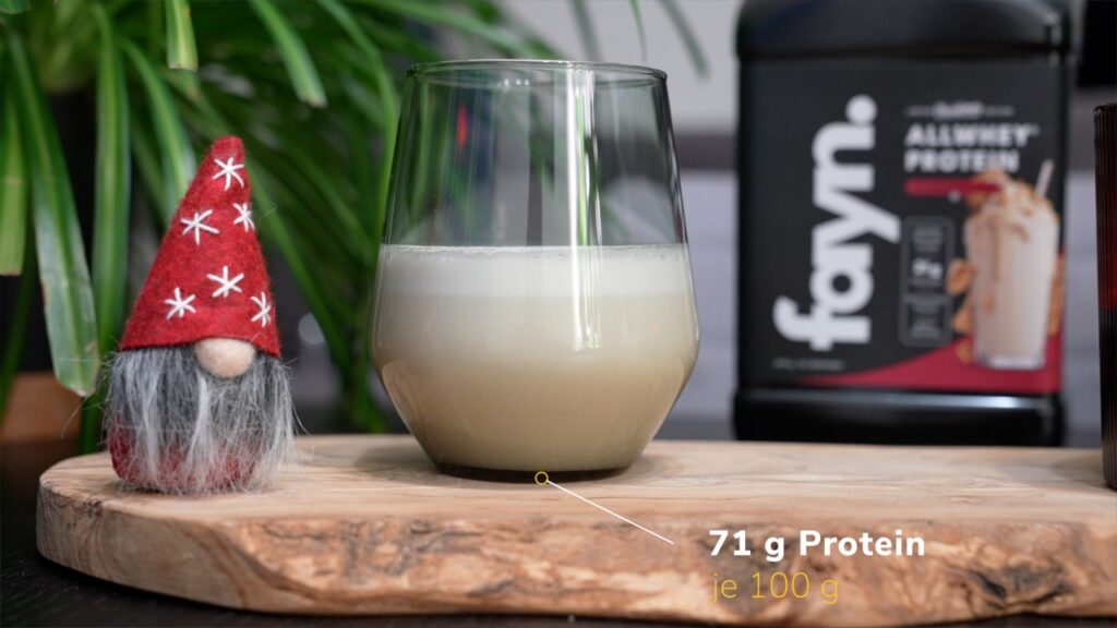 Weiter gehts mit der Marke fayn. und hier gab es nach den Riegeln nun auch ein weihnachtliches Whey mit Butterspekulatius Geschmack. Besonderheit hier ist, dass fayn. erstmals sogar kleine Spekulatiusstückchen im Pulver verarbeitet hat. Das senkt natürlich etwas den Eiweißgehalt – also wir sprechen von insgesamt 71 g, was dann schon 6 g weniger sind als eben noch bei EVO – aber es verpasst dem Pulver natürlich ein gewisses Etwas, was gerade bei einem limitierten Weihnachtsflavour dann auch erlaubt sein sollte, finde ich.
