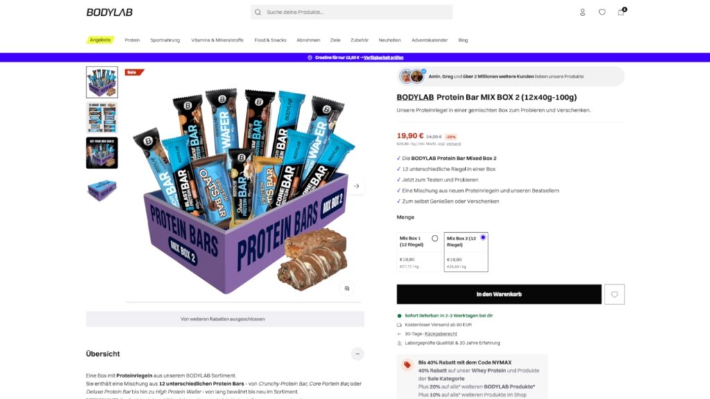 Bodylab ist zum Beispiel absoluter Stammgast in diesem Format und das in der Regel sogar auch gleich mit mehreren Produkten. Und was mir persönlich richtig gut gefällt ist, dass sie dem Kunden immer mehr die Möglichkeit geben, sich vor dem Kauf einer großen Packung erst einmal ein Bild zu machen. So erschienen jetzt nämlich einmal die Whey Protein Sample Box 1 mit 24 verschiedenen Flavours aus deren Whey Protein Sortiment sowie die Protein Bar Mix Box 2 mit wiederum 12 verschiedenen Proteinriegeln. Dieses Mal sogar inklusive Protein Oat Bars und Protein Wafers.