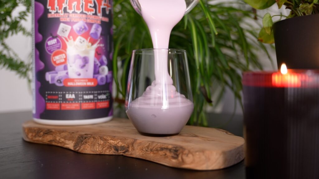 Ein ähnlicher Fall bezüglich wie eben schon bei Peak bezüglich der Verfügbarkeit betrifft auch dieses Honest Whey hier von Sinob im Halloween Milk Geschmack aka Vanille Marshmallow. Das Besondere am Honest Whey ist ja vor allem dieser Volac Rohstoff, der von grasgefütterten Weidekühen stammt und in dem Falle auch diese lila Farbe, die einen auch beim Trinken echt ein bisschen verwirrt, weil man einfach einen fruchtigen Geschmack erwartet, das Ganze aber eben nach Vanille Marshmallow schmeckt. Denn das tut es nämlich tatsächlich, wobei für mich die Vanille Note etwas überwiegt.