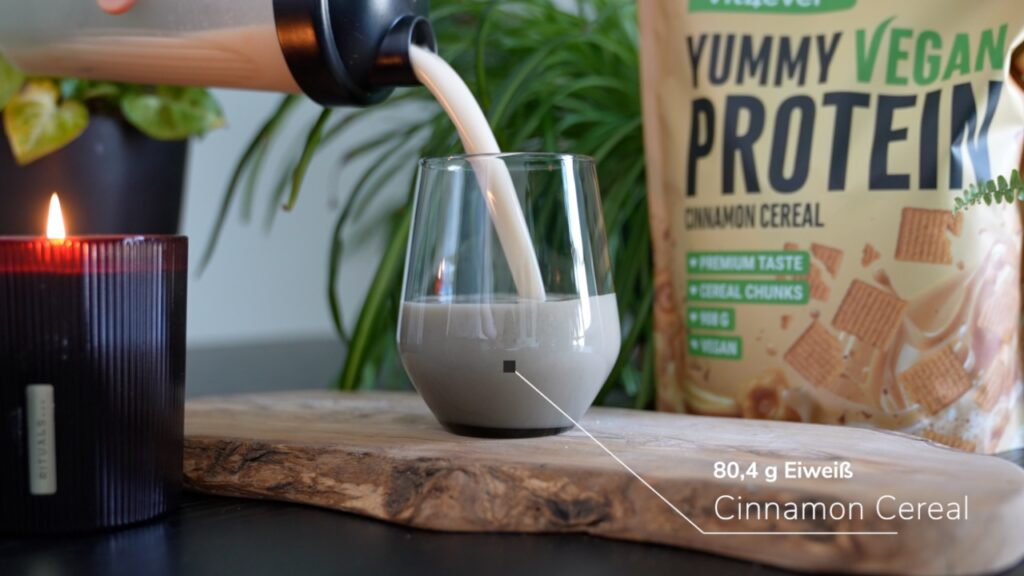 Das alleine ist schon gut, zumal man so auch einen echt starken Eiweißgehalt erreicht, allerdings ist dann auch noch der Geschmack sehr gut gelungen. Durch das Ackerbohnenprotein haben wir hier eine verhältnismäßig flüssige Konsistenz und einen leicht nussigen, erdigen Eigengeschmack, allerdings ist dieser bei weitem nicht so ausgeprägt wie bei einem Soja- oder Erbsenprotein, was dann auch den jeweiligen Geschmack an sich – und davon gibt es zum Start weg direkt wirklich viele – noch mehr zu Geltung kommen lässt.