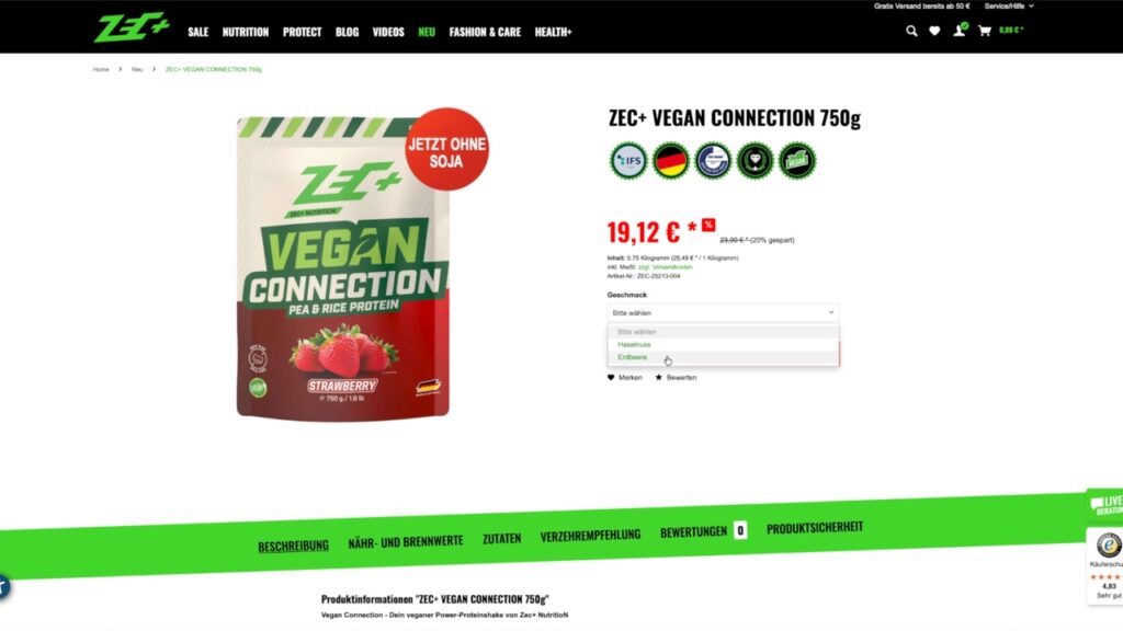 Ob das auch bei unserem letzten Neu-Release dieser Folge, dem überarbeiteten Vegan Connection von Zec+ in den Geschmacksrichtungen Schokolade und Erdbeere der Fall ist, kann ich Stand heute allerdings noch nicht sagen, weil nicht probiert, erfahrungsgemäß ist dies aber bei einem Mix aus Erbsen- und Reisprotein eher nicht der Fall. Diese Formel war zwar zur Anfangszeit der veganen Proteine noch sehr bewährt und beliebt – vor allem weil man so eine relativ hohe Eiweißqualität ohne den Zusatz von weiteren Aminosäuren erreicht – mittlerweile muss man allerdings festhalten, dass diese Formel doch etwas in die Jahre gekommen ist. Heutzutage erreicht man mit anderen Mitteln einfach eine nochmal höhere Proteinqualität und auch die Konsistenz ist besser durch den Verzicht des sandigen Reisproteins.