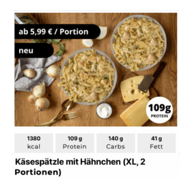 Es ist wahrhaftig sehr schwer ein Gericht wie Käsespätzle wirklich einigermaßen clean hinzubekommen, aber diese Umsetzung hat mir echt gefallen. Die Menge an Käse ist genau richtig gewählt, dass man immer noch von Käsespätzle reden kann, aber das Gericht dennoch nicht zu fettig wird. Das Hähnchen darin, das für meinen Geschmack ruhig vorher nochmal etwas schärfer angebraten werden könnte, gehört zwar traditionell nicht in dieses Gericht, ist aber halt notwendig, damit man auf einen vernünftigen Eiweißgehalt kommt.