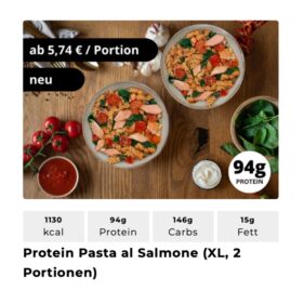 Die Protein Pasta al Salmone ist ein Essen für alle, die etwas mit Wildlachs anfangen können. Dieser Mix aus Nudeln, Tomaten, Spinat und Lachs in der cremigen Sahne-Yoghurt Sauce ist wirklich sehr lecker und überzeugt zudem auch mit guten Nährwerten. Durch die Tatsache, dass es sich hier um Wildlachs handelt, sind Kalorien und Fettgehalt nämlich überraschend niedrig.